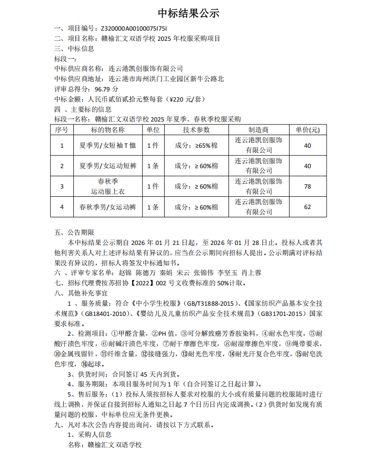赣榆汇文双语学校2025年春秋、夏季校服采购项目中标结果公示