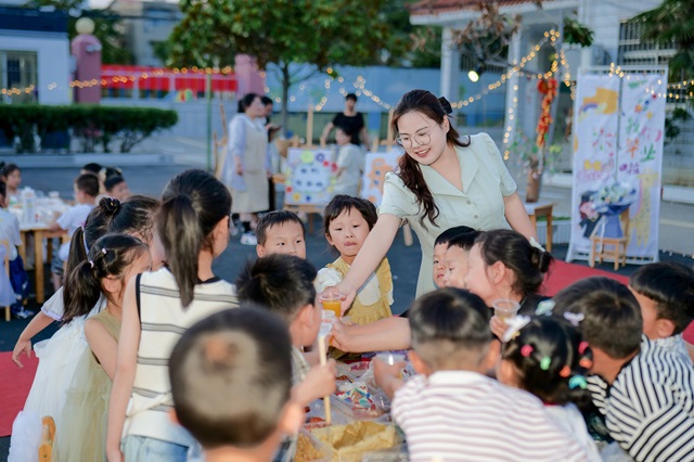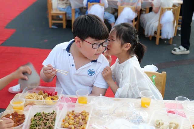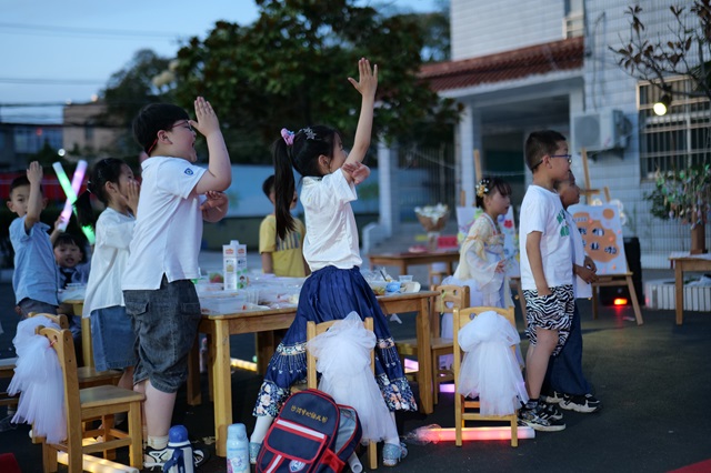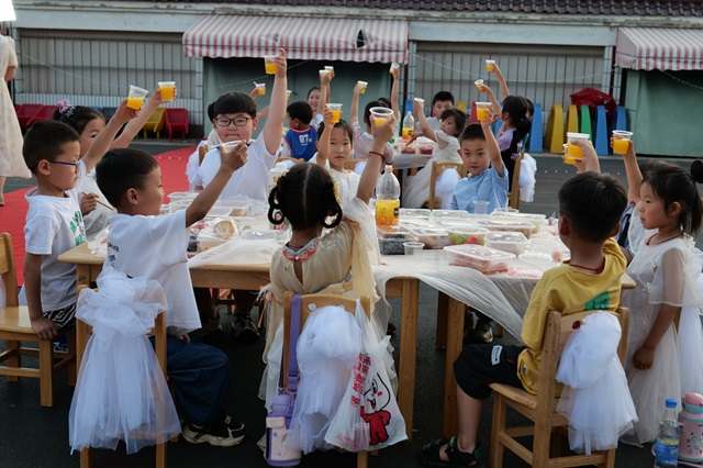 紧接着是园长开场致辞,给小朋友们送上了毕业祝福:祝愿孩子们在筑梦未来的路上,健康成长、聪明伶俐、开心每一天,希望小朋友们吃的开心、玩的开心,宣布“吃大席”活动正式开始。现场气氛热烈,孩子们举杯共庆,放着鞭炮,共同度过这个特别的时刻。