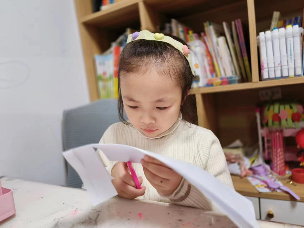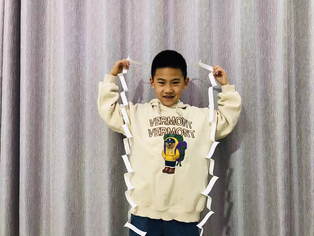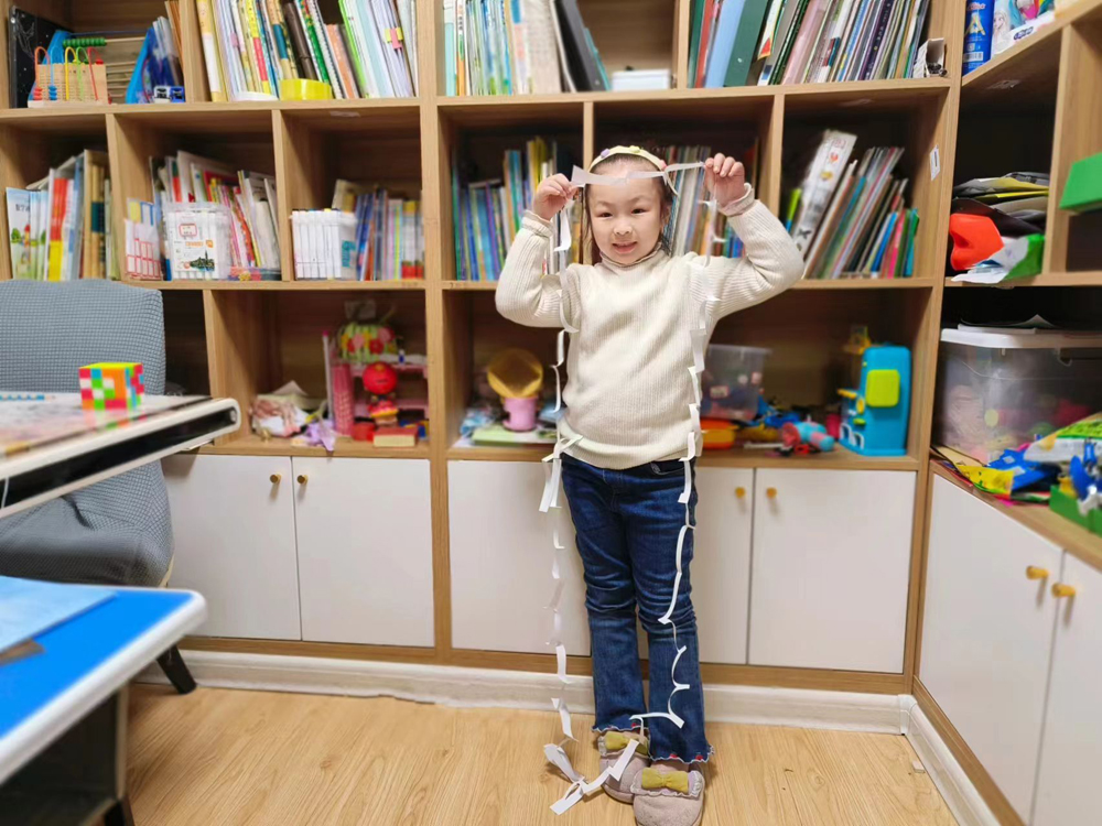 一张小小的A4纸,能让人从中间穿过去,孩子们直呼:“哇,好神奇!”游戏从平面到立体,运用几何学的知识,用巧妙的剪法将纸张围城的圈不断扩大,最后一张纸能够变成一个闭合的大圆圈,这个游戏打破了孩子们的定式思维,不仅让孩子感受到数学的魅力,还能让孩子明白,开动脑筋就能发现不一样的世界。