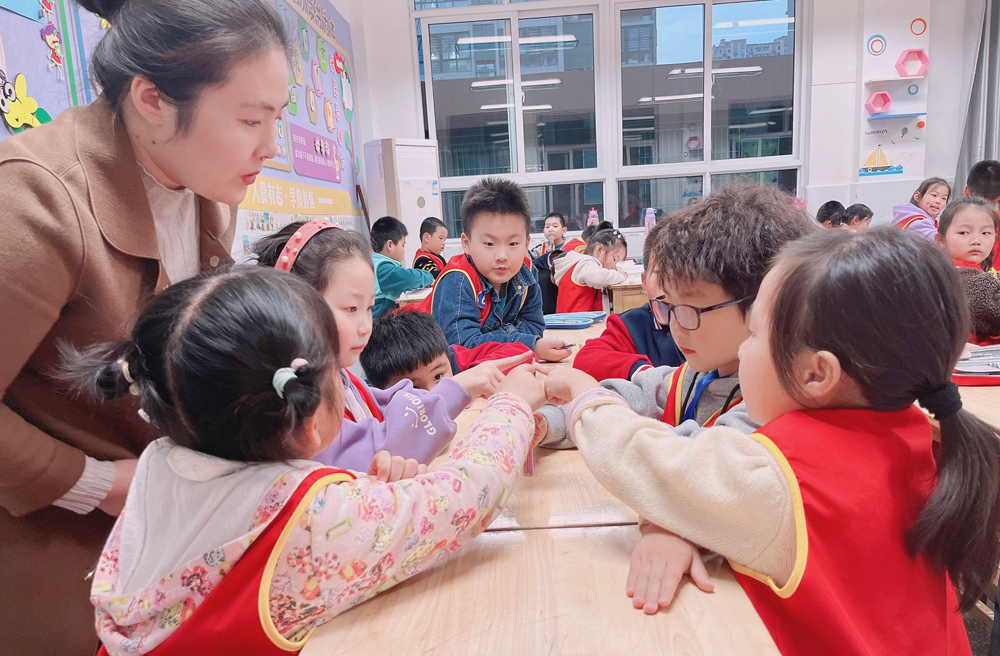 课后服务时间,老师与孩子们一起玩“用铅笔比长短”的游戏:拿3根不同长短的铅笔,老师把几根筷子最下面部分用手抓住,学生按照顺序挑选筷子,选到最长的游戏成员可以获得1颗星星,比一比谁收集的星星最多!