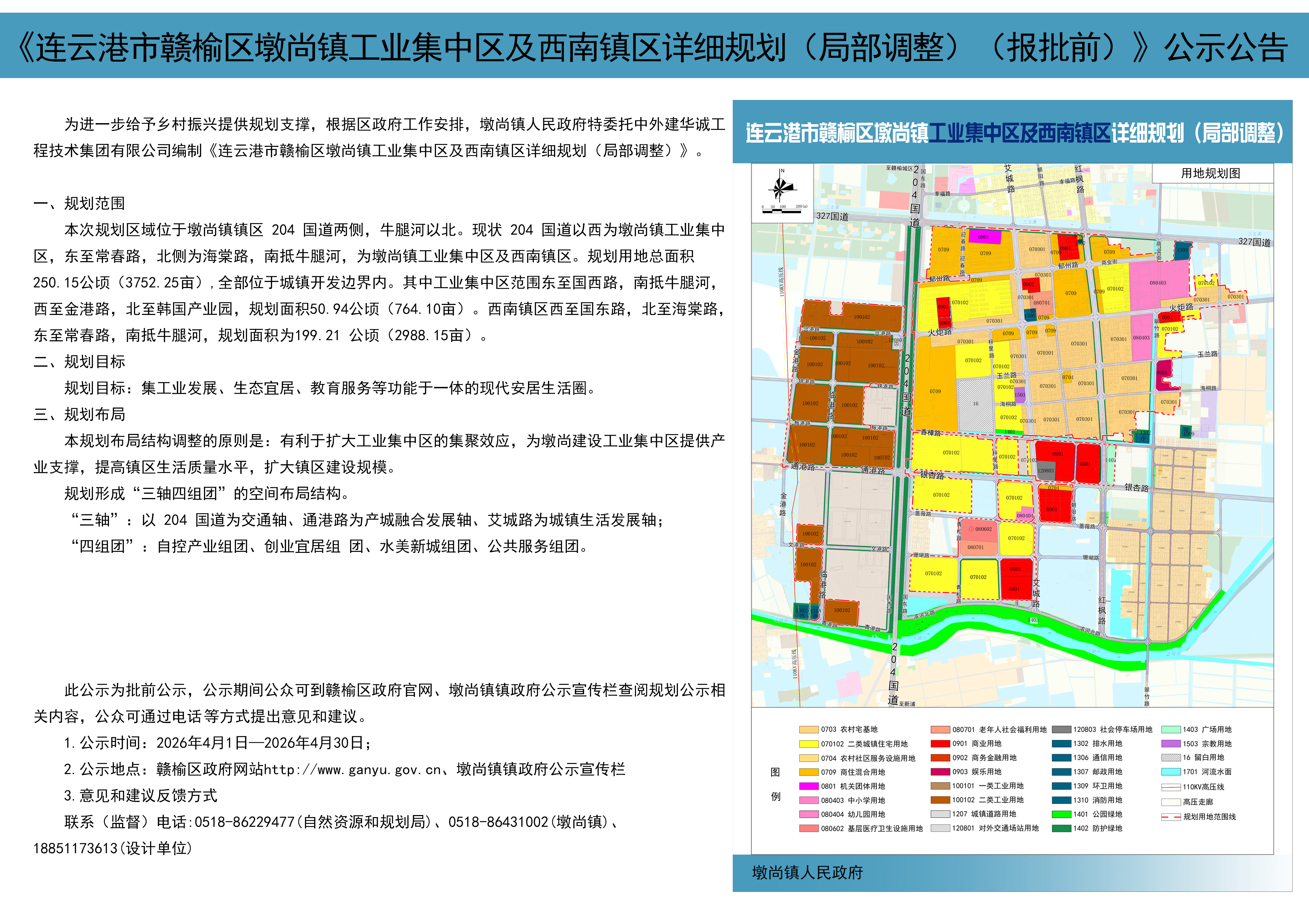 为进一步给予乡村振兴提供规划支撑,根据区政府工作安排,墩尚镇人民政府特委托中外建华诚工程技术集团有限公司编制《连云港市赣榆区墩尚镇工业集中区及西南镇区详细规划(局部调整)》。此公示为批前公示,公示期间公众可到赣榆区政府官网、墩尚镇镇政府公示宣传栏查阅规划公示相关内容,公众可通过电话等方式提出意见和建议。