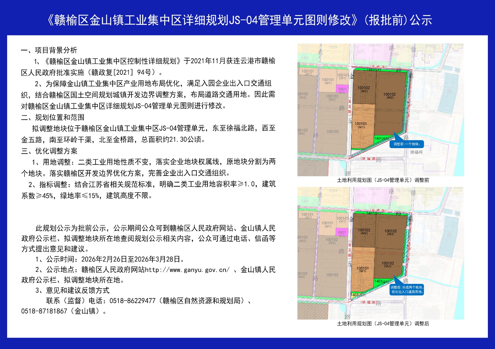 《赣榆区金山镇工业集中区详细规划JS-04管理单元图则修改》(报批前)公示