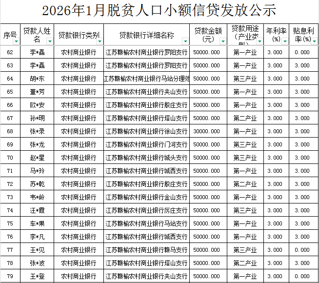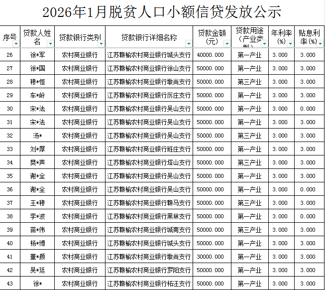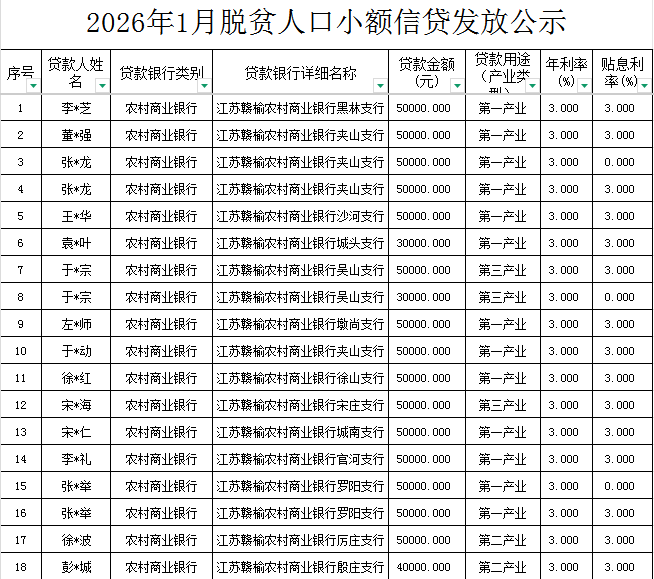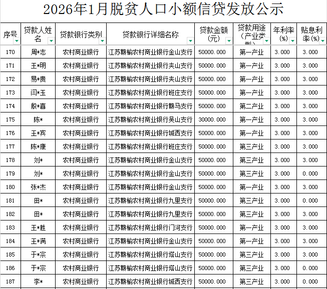| 信息名称: | 关于2026年1月脱贫人口小额信贷发放情况的公示 | 文件下载: | |