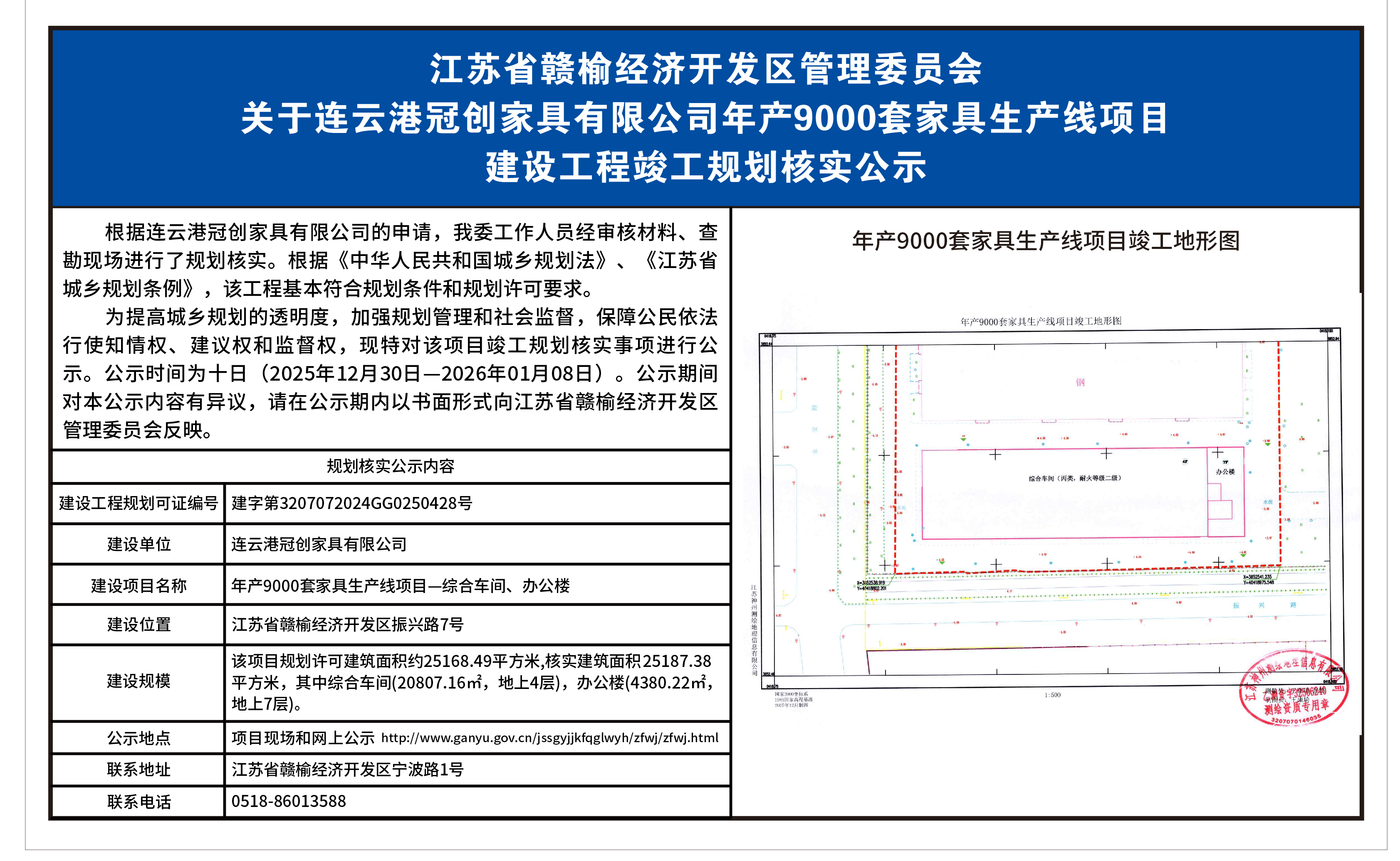连云港冠创家具有限公司年产9000套家具生产线项目—综合车间、办公楼建设工程竣工规划核实公示