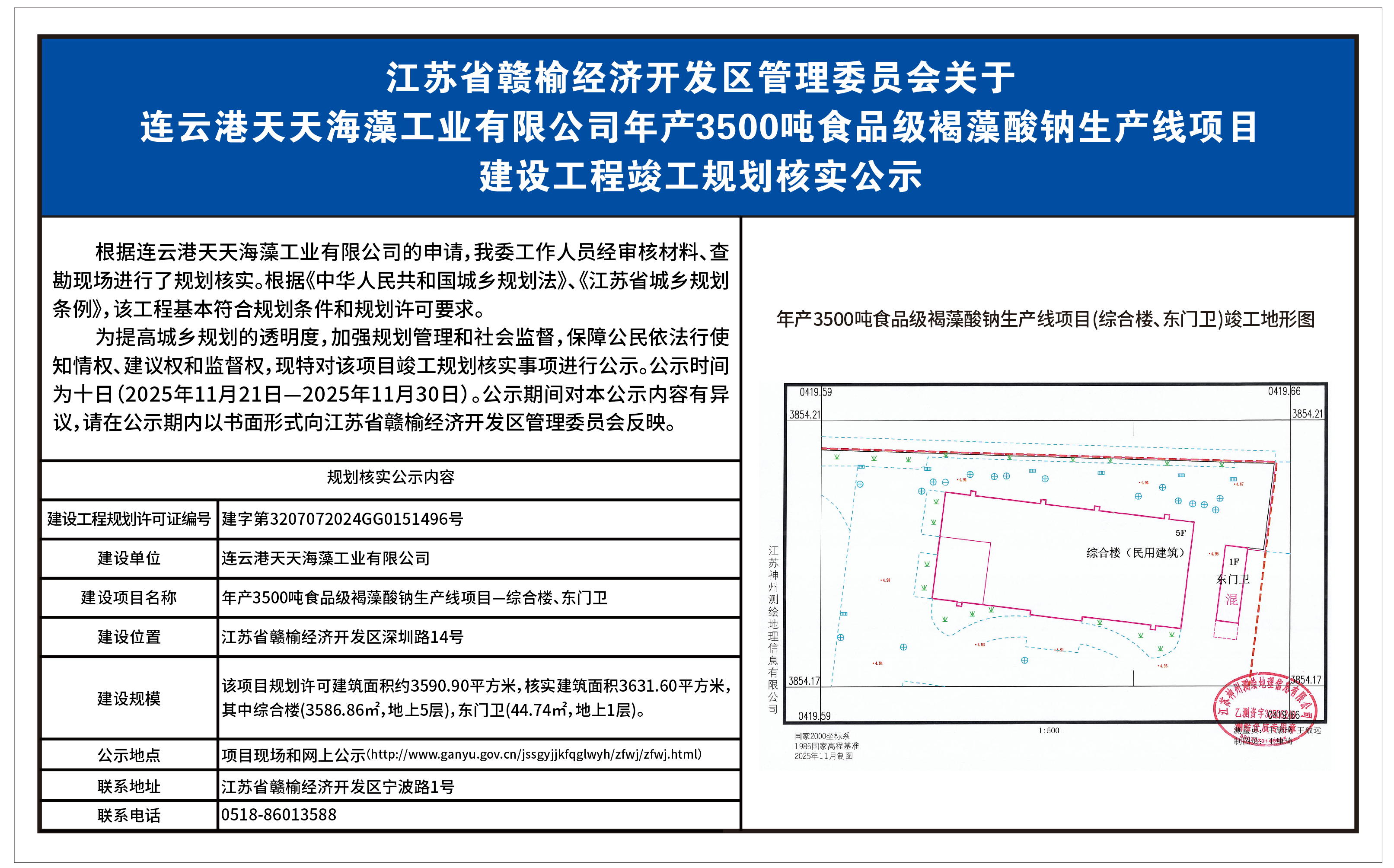连云港天天海藻工业有限公司年产3500吨食品级褐藻酸钠生产线项目—综合楼、东门卫建设工程竣工规划核实公示