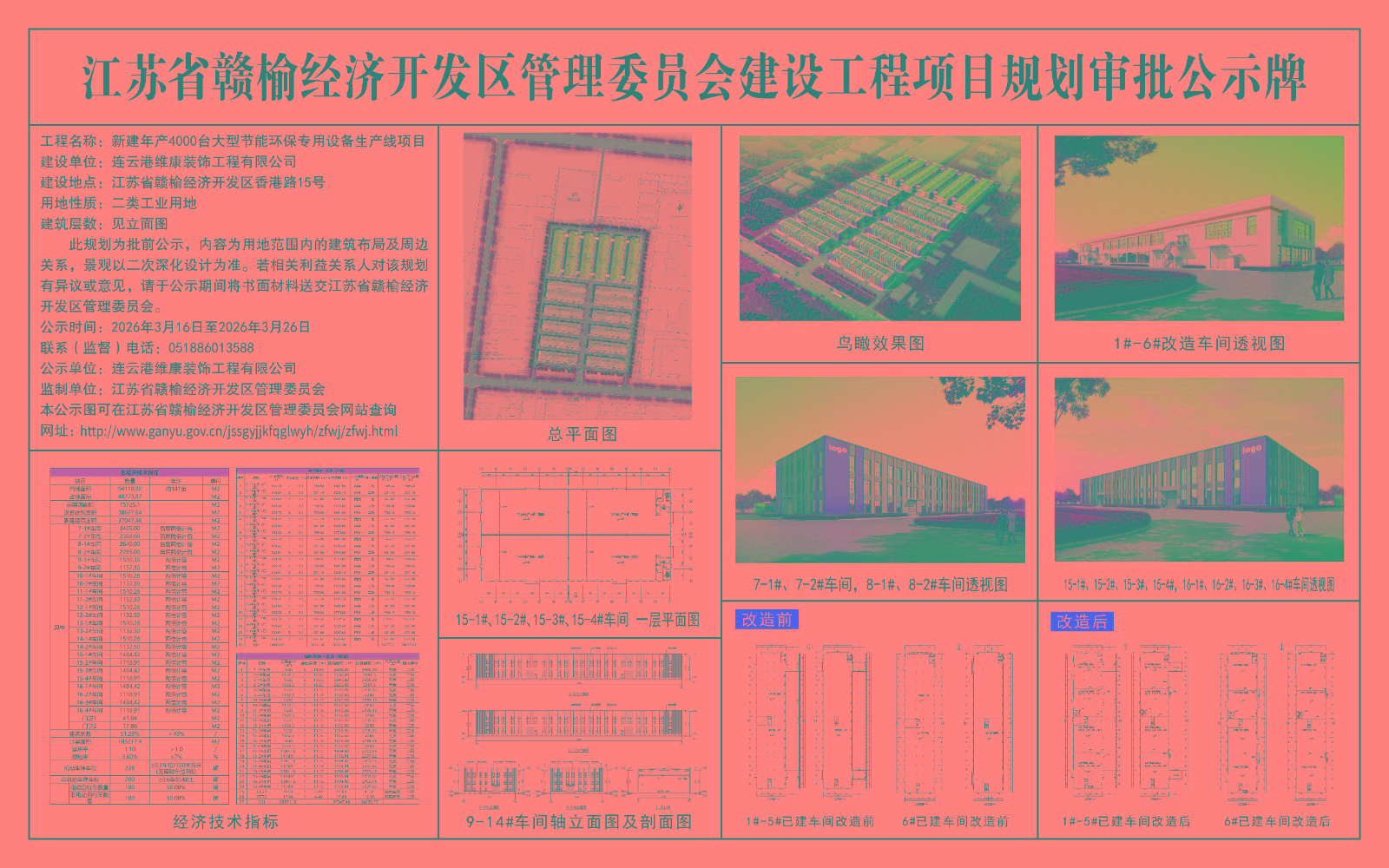 连云港维康装饰工程有限公司新建年产4000台大型节能环保专用设备生产线项目批前公示