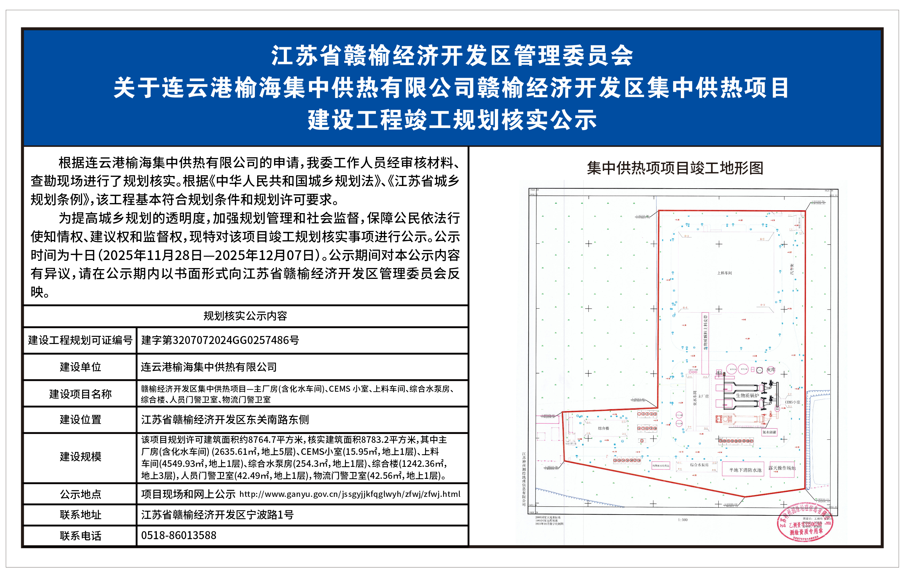 连云港榆海集中供热有限公司赣榆经济开发区集中供热项目—主厂房(含化水车间)、CEMS 小室、上料车间、综合水泵房、综合楼、人员门警卫室、物流门警卫室建设工程竣工规划核实公示