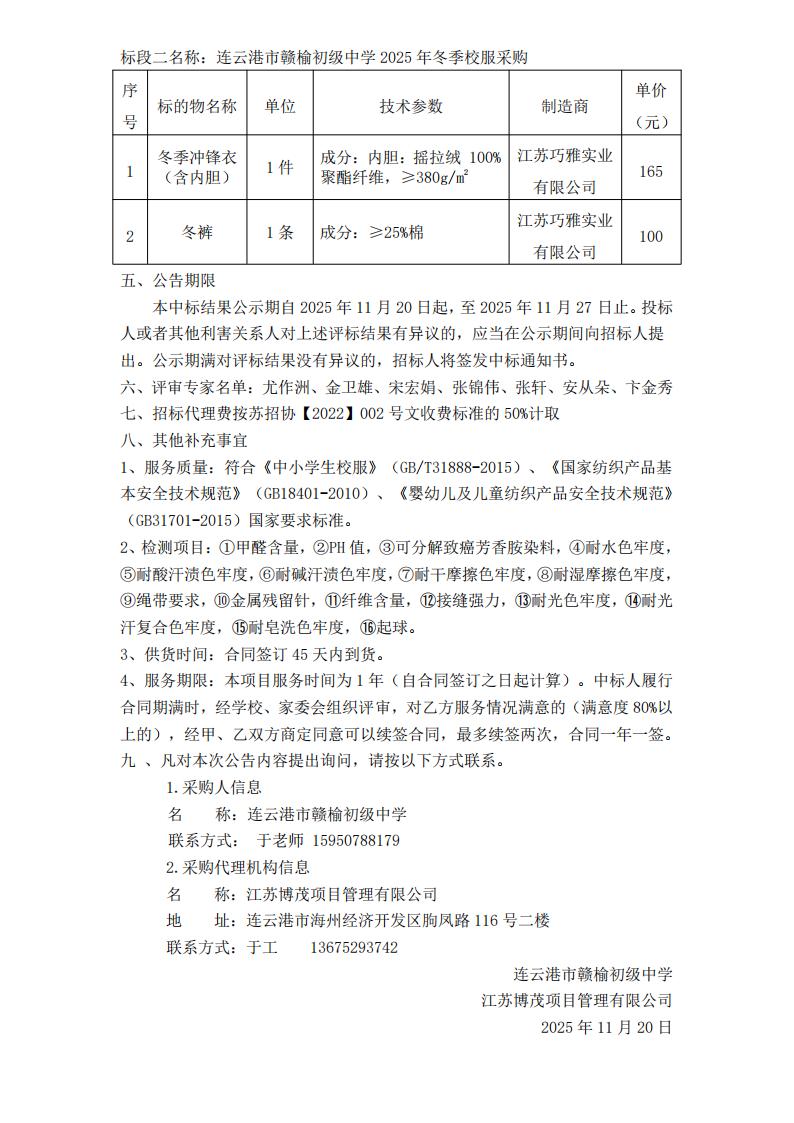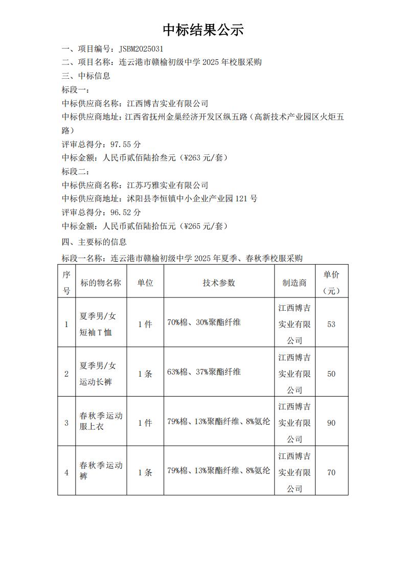 连云港市赣榆初级中学2025年校服采购项目中标结果公示