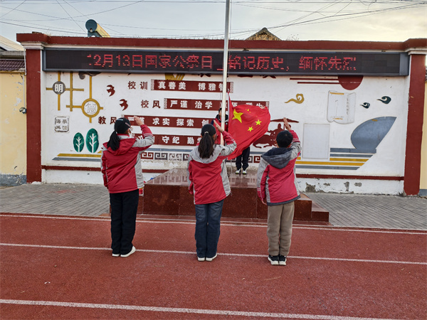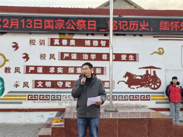 升旗仪式上,苏高宁向全校师生讲述了南京大屠杀血腥的历史,同时告诫我们必须铭记历史,捍卫和平,努力学习,为祖国的强大贡献力量。
