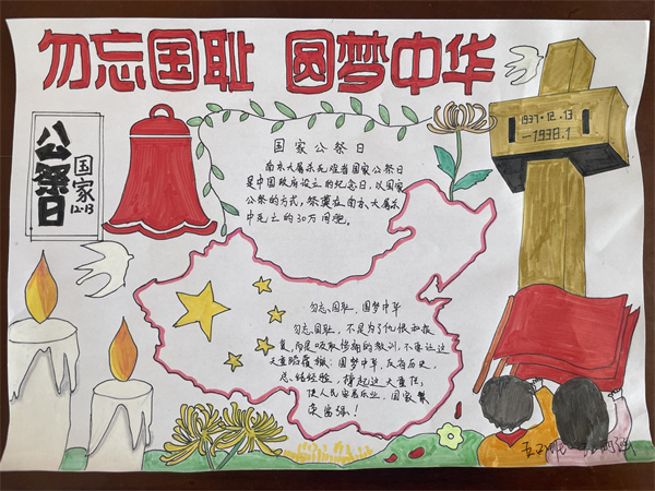 班会课上,各班主任向学生们展示南京大屠杀的历史背景和事件经过,通过观看反映和南京大屠杀有关的纪录片和电影,同胞们的苦难深深地触动了学生们的心,同时也激励学生们将爱国主义扎根心中,化悲愤为动力,汲取历史教训,努力奋斗,肩负起时代赋予的责任。学生们还通过手抄报、征文感悟等形式展现了奋发图强的决心,号召更多的朋辈了解历史、铭记历史,为建设伟大强国努力奋斗。