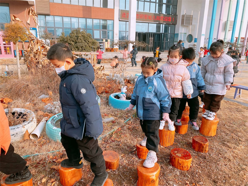在幼儿园的集体户外锻炼活动中,各个年龄段的幼儿在教师引导下,以个体或群体的方式,运用全身感官共同参与体育活动。既满足了孩子爱玩好动的天性,又增加了他们与大自然的亲近感。