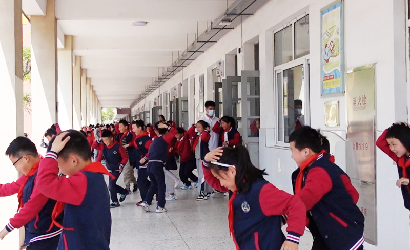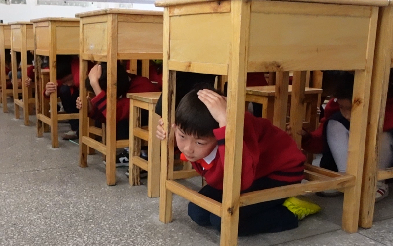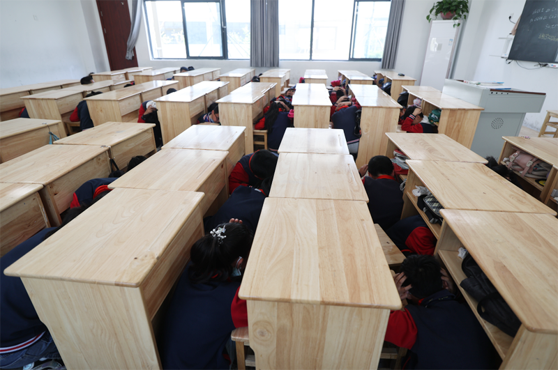 第一次警报响起,教师指挥学生避震,引导学生双手护头,躲到就近的桌子底下,尽量蜷曲身体,降低身体重心。