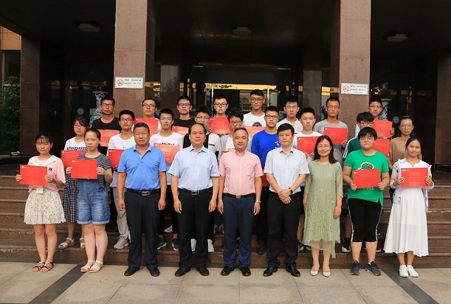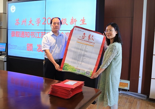 7月21日下午,苏州大学招生就业处处长查佐明教授、文学院党委书记孙宁华教授等专程到赣榆高中为苏州大学2019级新生颁发录取通知书。区委教育工委书记、区教育局局长陆建国参加颁发仪式。