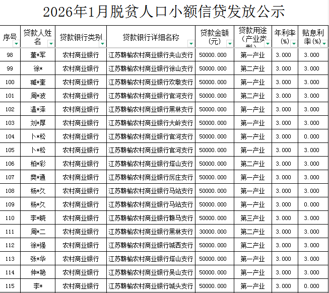 根据《江苏省“十四五”脱贫人口小额信贷政策实施意见》(苏银保监发〔2021〕46号)文件要求,现将1月份脱贫人口小额贷款发放情况公示如下。