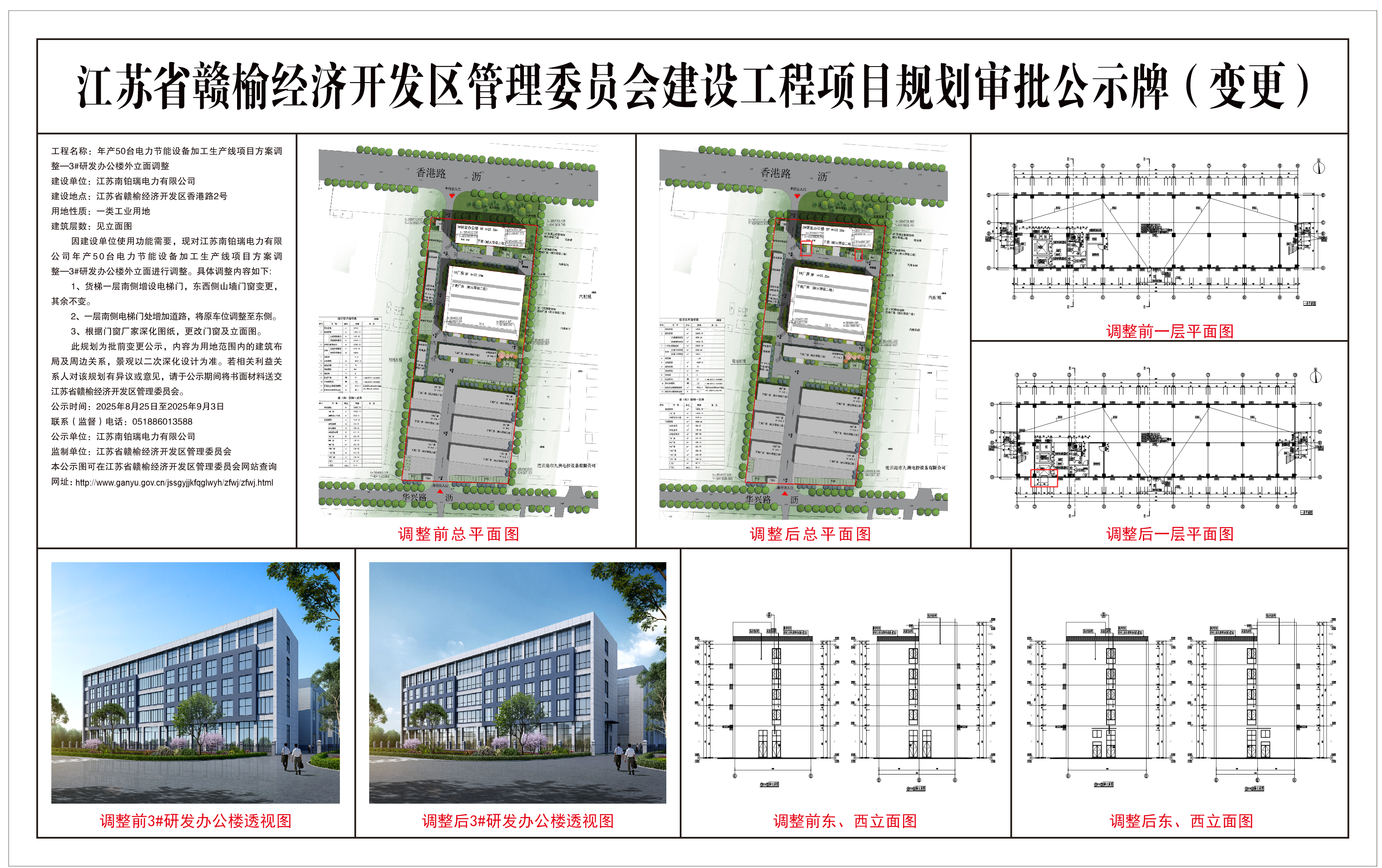 江苏南铂瑞电力有限公司年产50台电力节能设备加工生产线项目方案调整—3#研发办公楼外立面调整批前变更公示