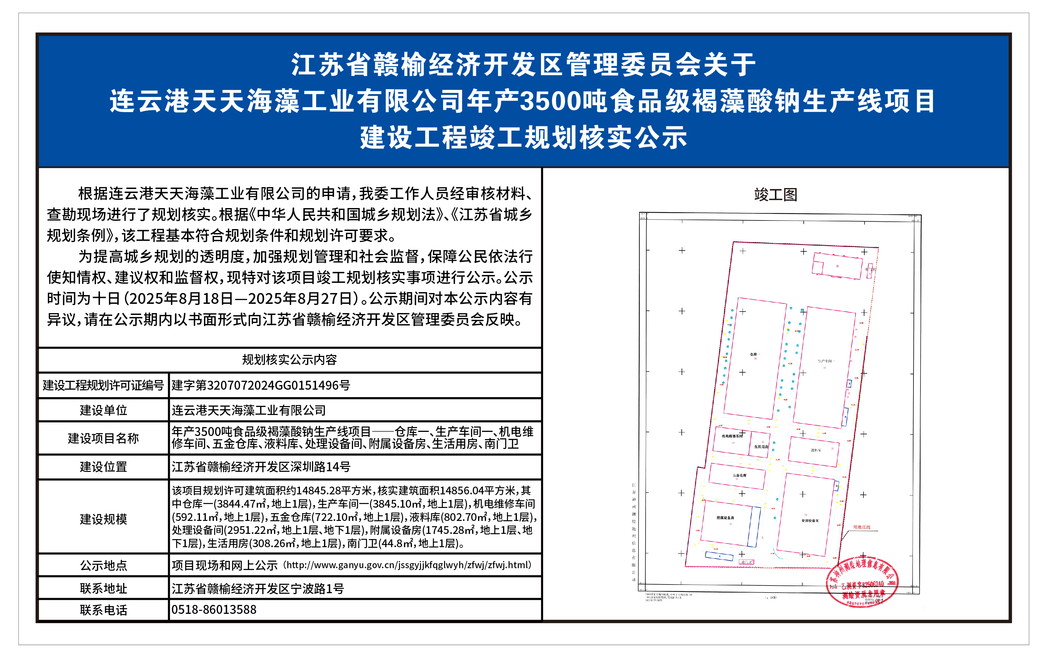 连云港天天海藻工业有限公司年产3500吨食品级褐藻酸钠生产线项目建设工程竣工规划核实公示